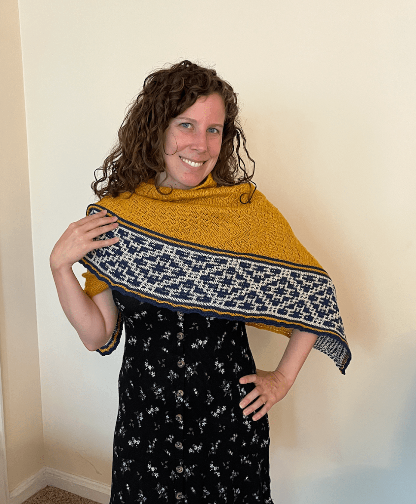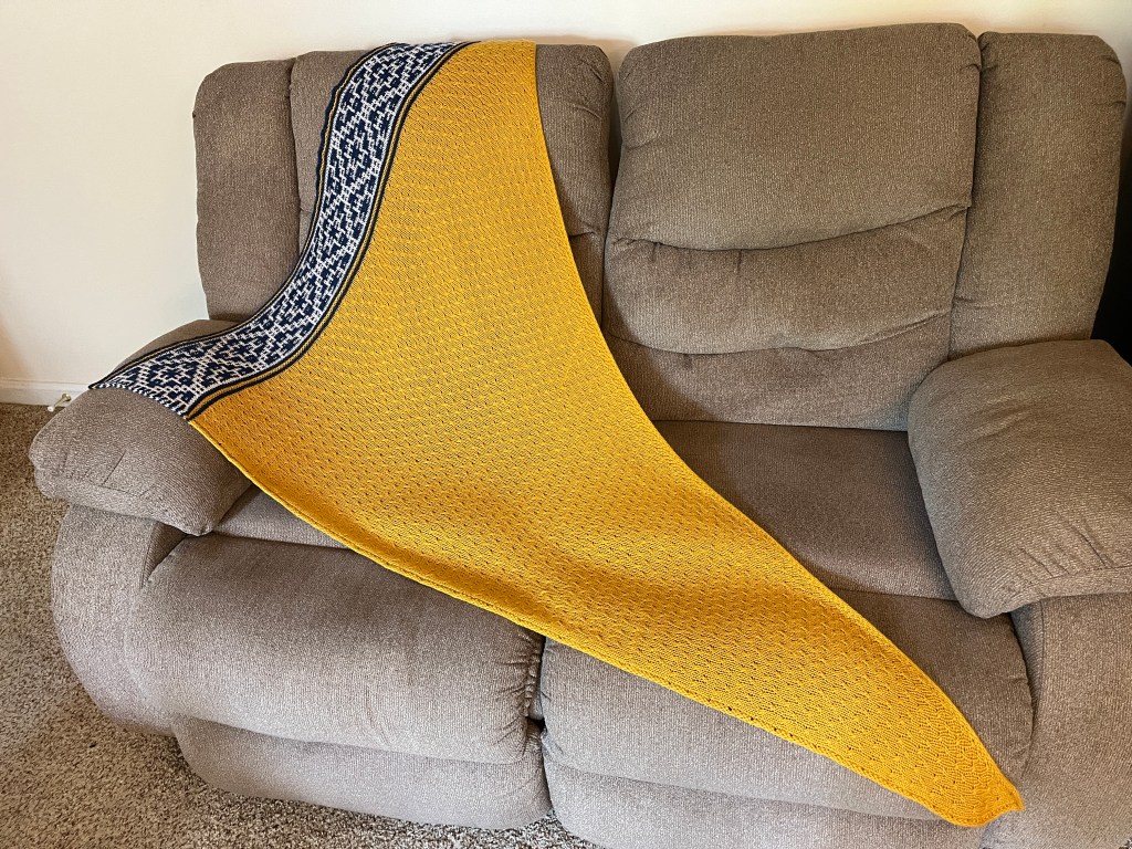 This is complete and has been gifted to its forever home! I’m thrilled at how it came out, although I nearly ran out of the gold yarn and had to cut two repeats out of the final pattern. I’m mostly annoyed since I actually swatched for this pattern and it should have worked out. The slipstitch colorwork border was a lot of fun, and a technique that I will definitely be using for future patterns!