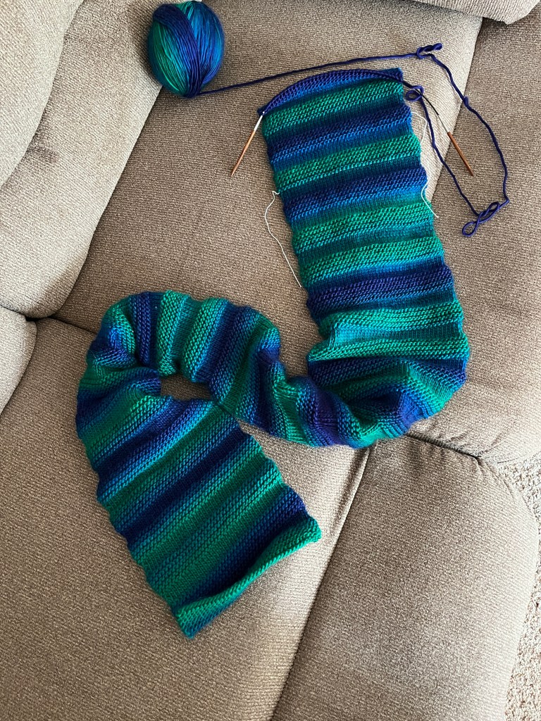 This one is nearly done! Just a few more repeats to go to make sure it’s appropriately long, comfy, and squishy!
