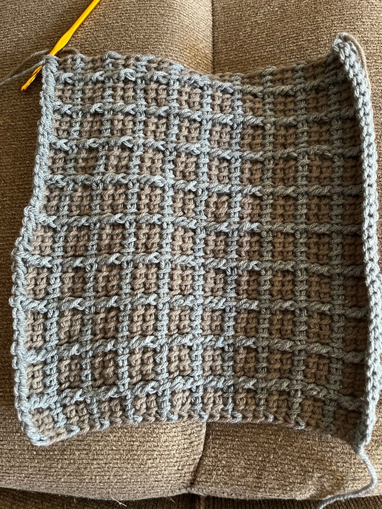 Block stitch square! Not quite finished, but a simple and easy repeat that’s kept me occupied