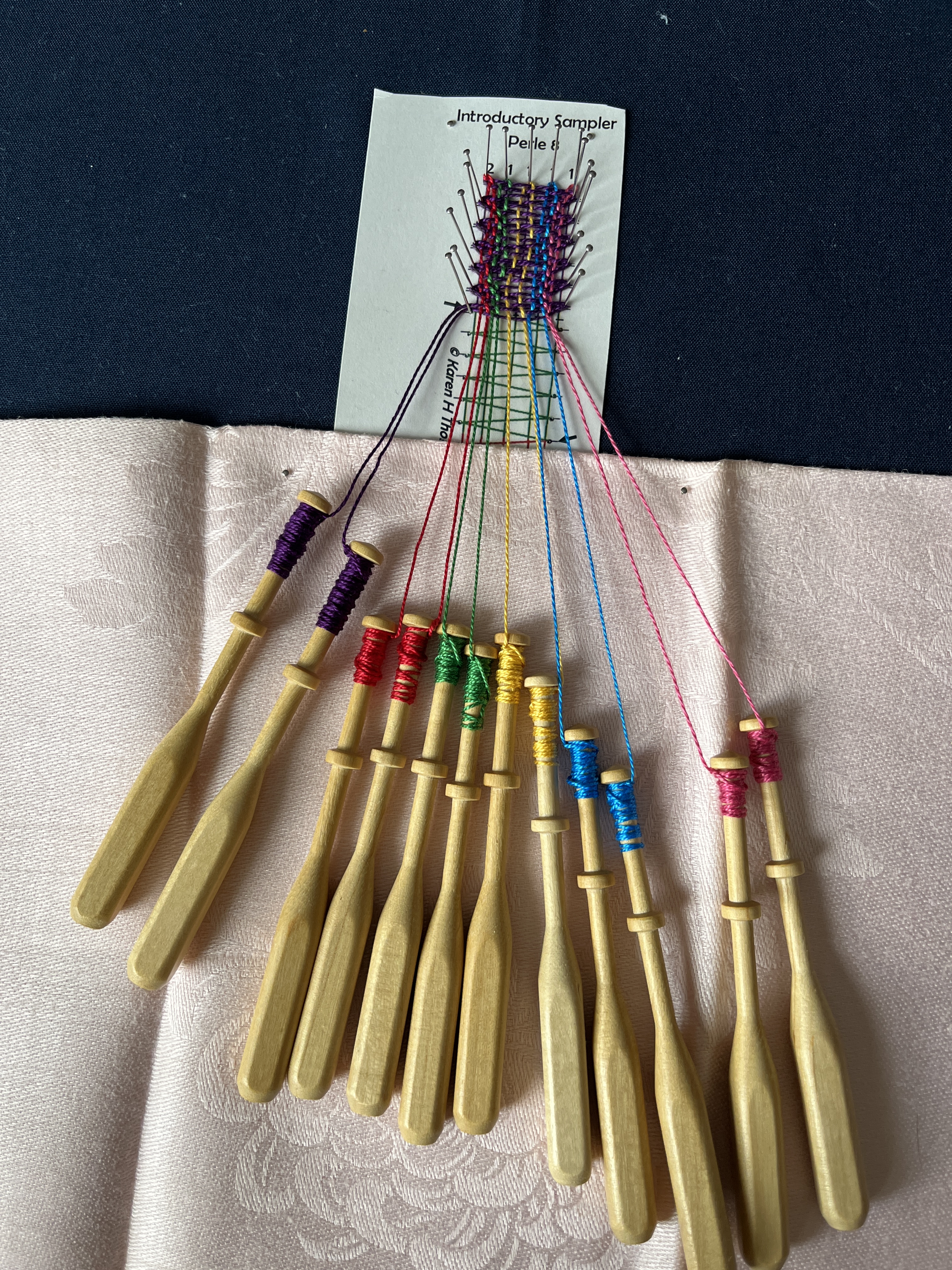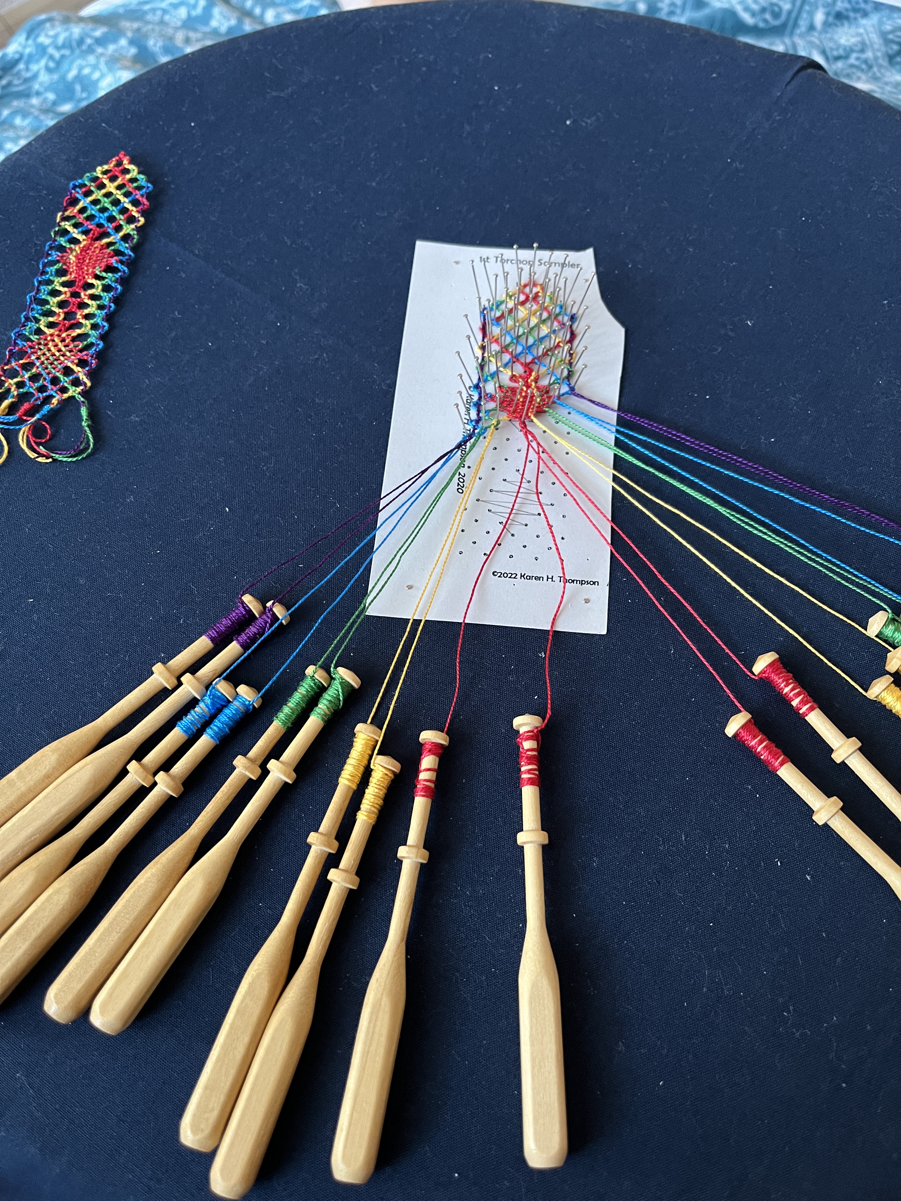 Since I don’t have enough to do, I decided to add Bobbin Lace to my repertoire of handicrafts. I went to an open house at The Textile Museum at George Washington University a few months ago, and they had loads of resources for spinning, lace making, weaving, knitting, and crocheting. I was in heaven! But I’ve been working on the basics of bobbin lace, which I’ve been interested in since I saw a Youtube video about Spanish women on the coast of Galicia who’ve done it for generations. Bobbin lace has been woven across Europe for centuries, predominantly in Italy, France, and Belgium. I love the art because it’s functionally weaving on a smaller scale, and it doesn’t require a massive loom. I’ve made a bunch of small sample pieces, and I’m looking forward to building on my skills to make larger items.