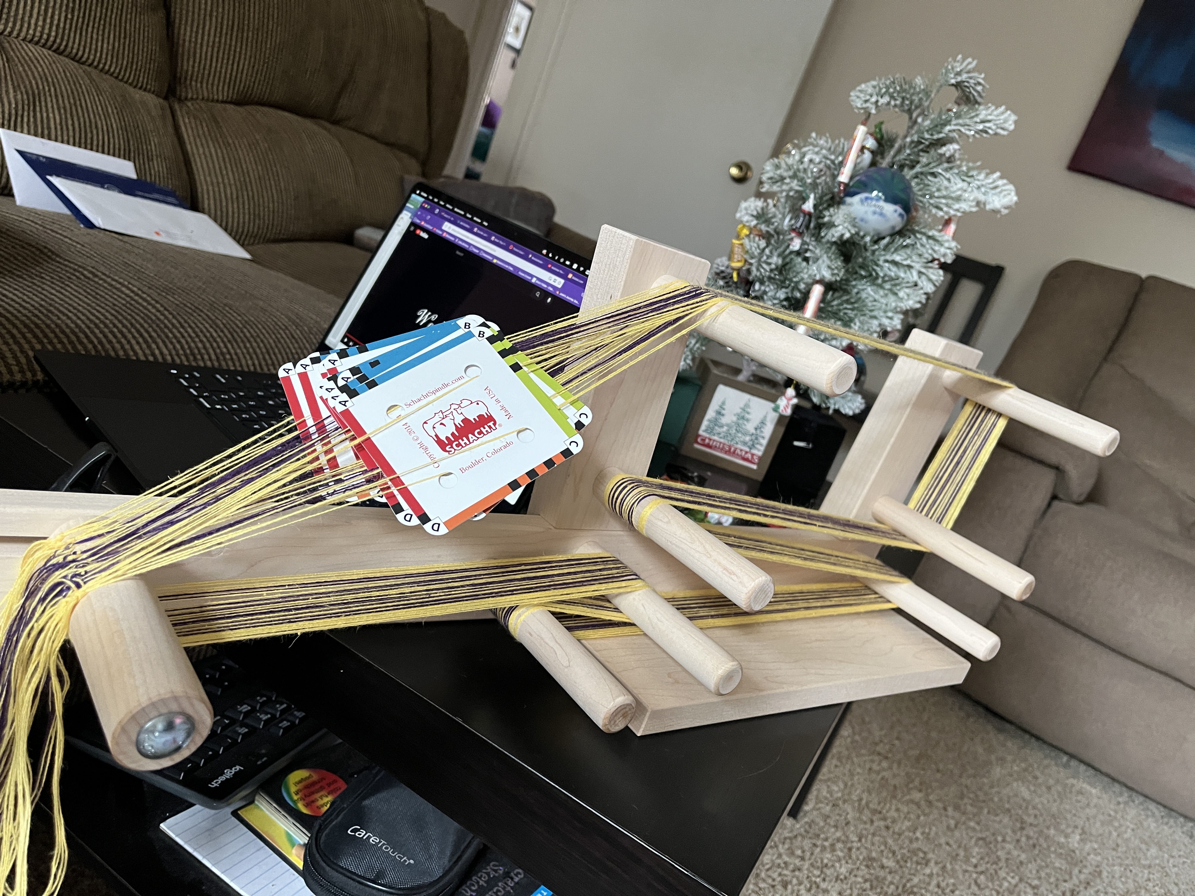 While in Massachusetts, I made a long-overdue pilgrimage to Webs, the largest yarn store in America, which was just a wonderful as I’d always imagined! I came back with an incredible haul of yarn, notions, and A LOOM!!! I finally pushed the button and bought myself an inkle loom! I’ve just started working on it the last few days, and I’m very pleased at how my first band is coming out.
