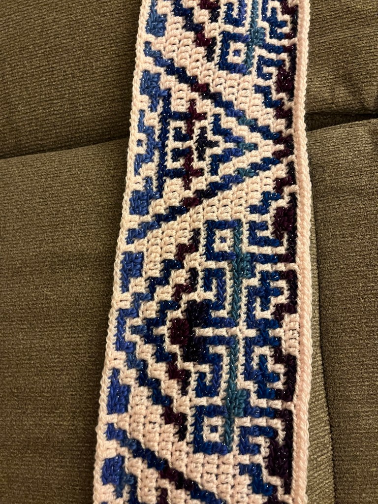 A gorgeous pattern I’m frantically working up so it will be finished in time to gift to its intended recipients. I’m using Hobbii Universe yarn in the colorway Interstellar for the design, with their Classic Acrylic in a light peachy-apricot for the main color.