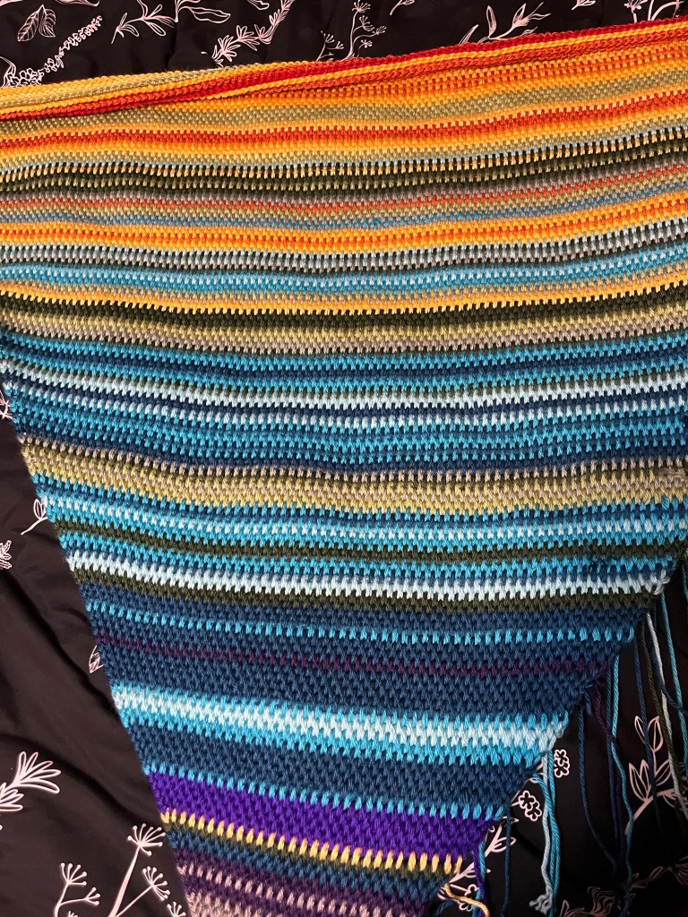 We’re into June now, and I’m really enjoying watching the color changes. I was worried I wouldn’t have enough yarn, but I think I’ll only need second skeins of a few of the colors. I hear a lot about folks ending up with enormous blankets larger than they’d intended, but mine is turning out much smaller than I thought it would be. It’s still lovely and squishy, though.