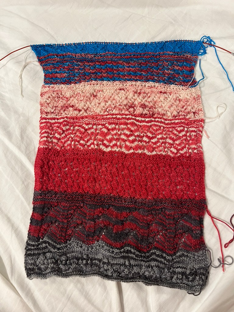 Nearly through all the mini skeins I brought with me, so it will soon go on hold until I can get back to the States to get the rest of the yarn.