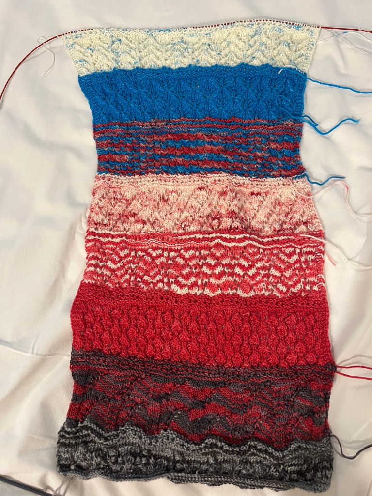 On the last mini skein (day 8), so this will soon be put on hold and then I need to decide if I want to knit a cowl or a tank top for my next project…