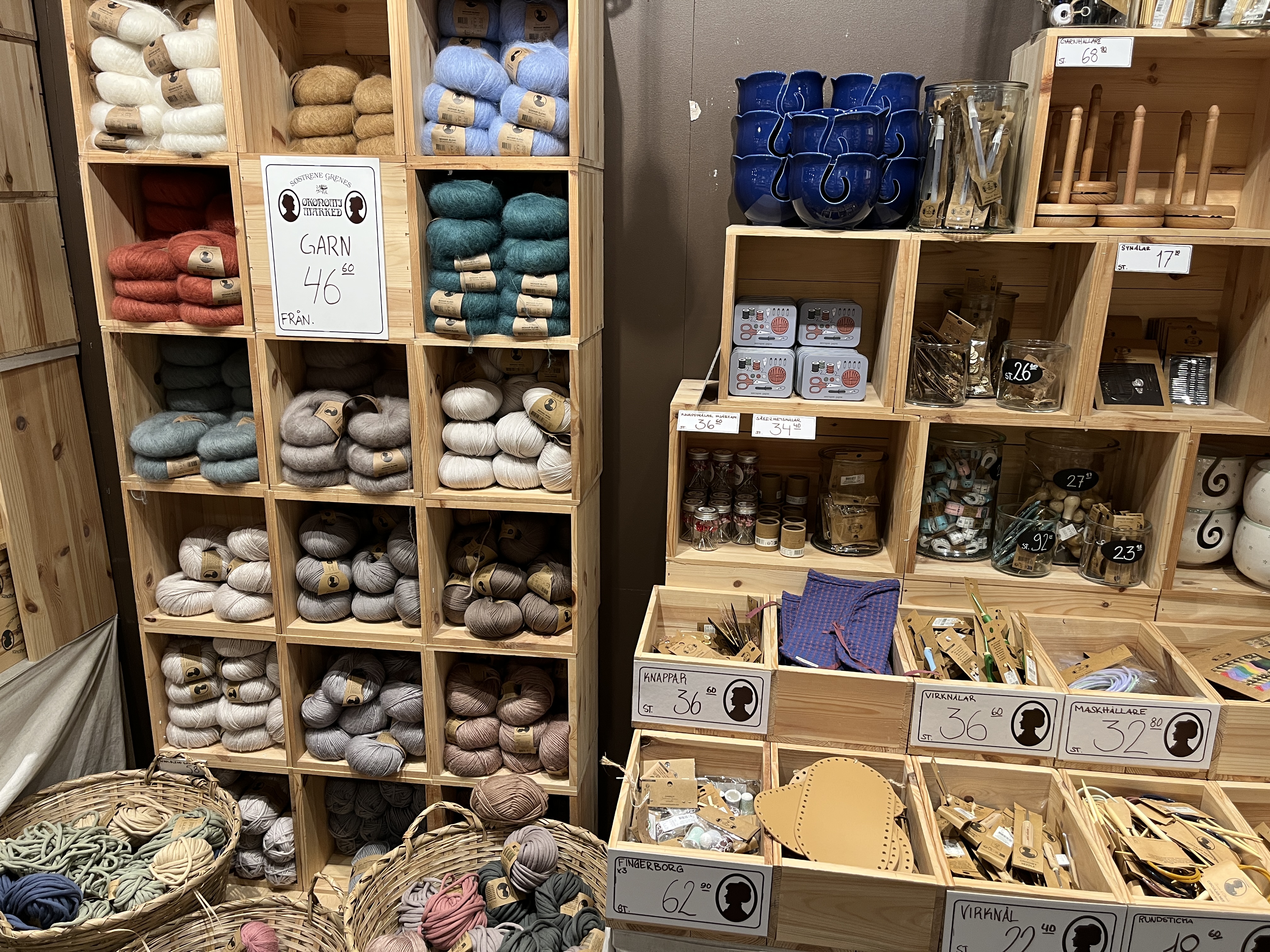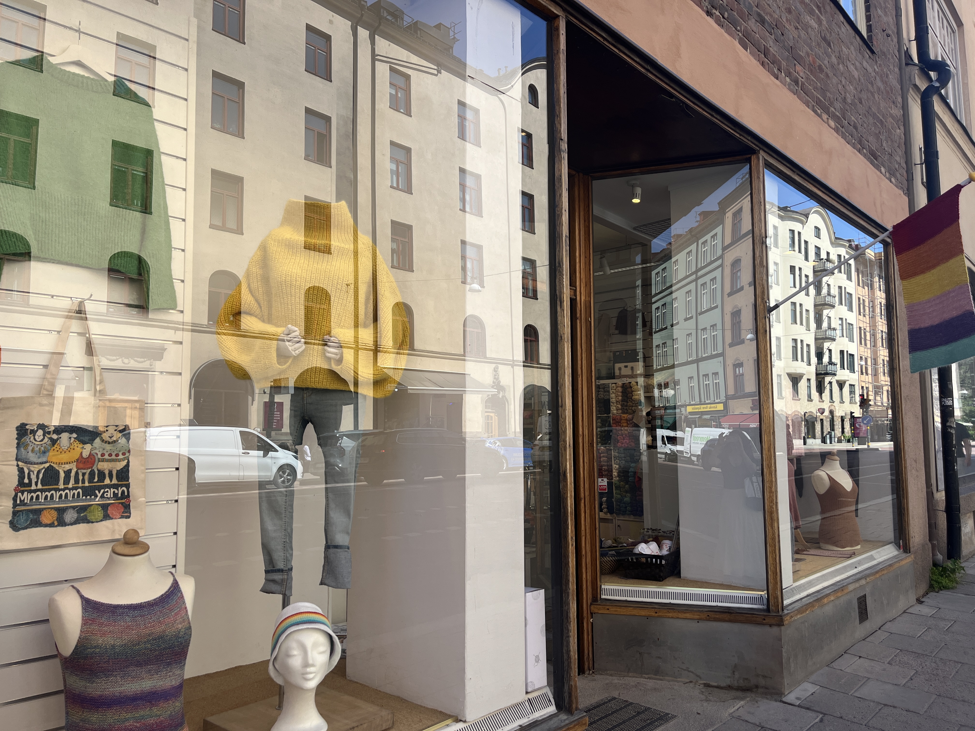 Officially my favorite yarn store in Stockholm, Litet Nystan is located in Södermalm. A knit rainbow flag hangs over the door, and the floor-to-ceiling shelves are stuffed with yarn. There’s a spacious feel to the store, despite it being crammed with shelves and displays of yarn and notions. I picked up some more yarn here – my first taste of Sandnes Garn!