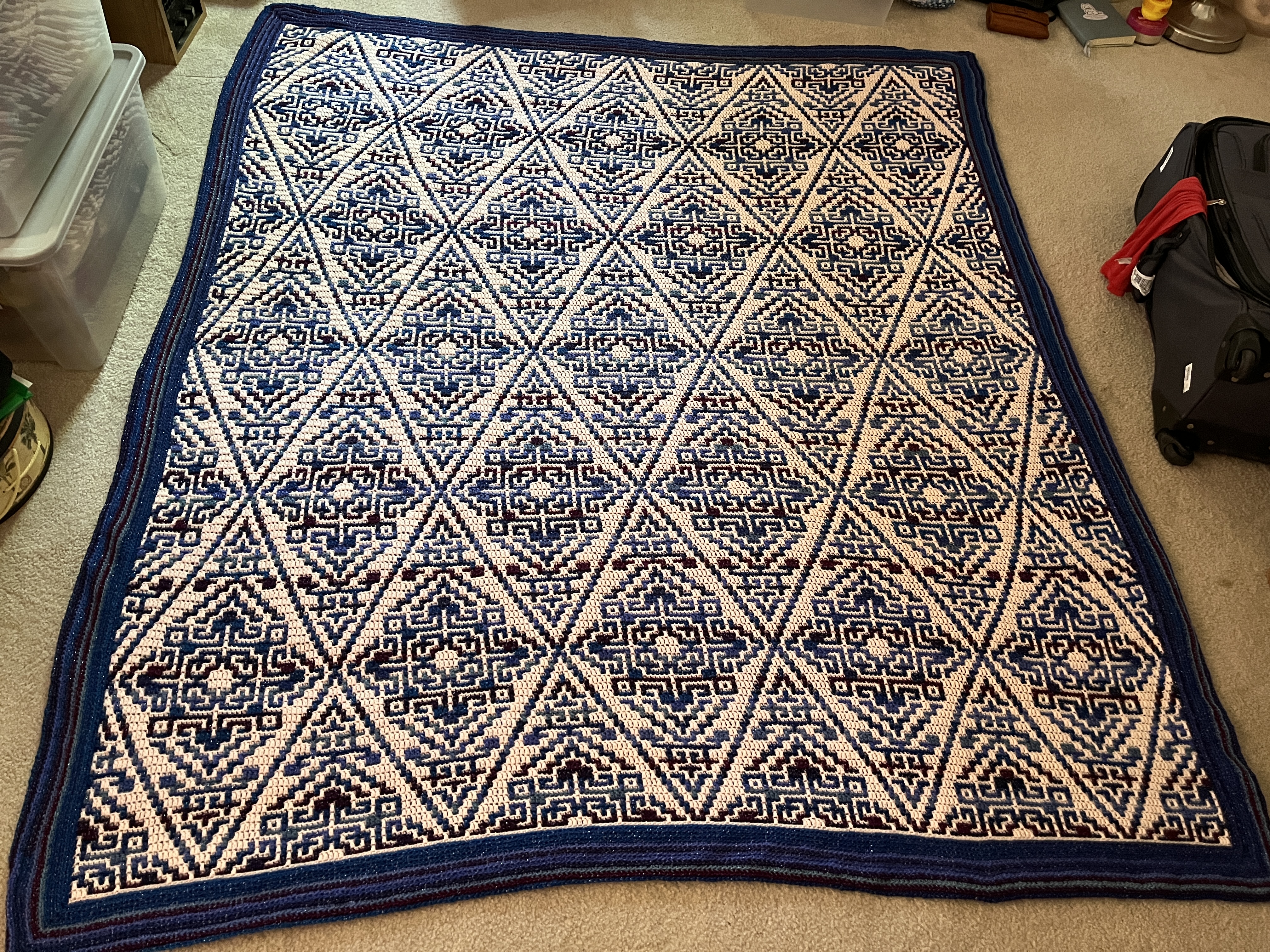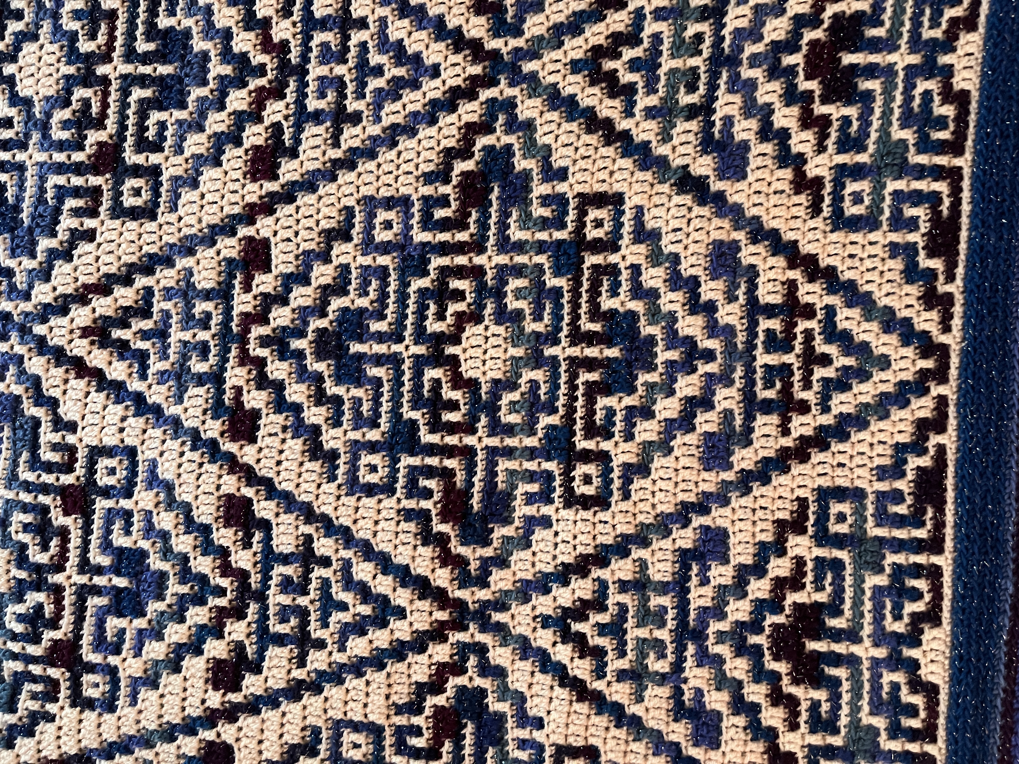 I can FINALLY show off my Aztecana blanket, designed by the amazingly talented BebaBlanket. I had to keep this one under wraps, as it was a gift for my brother and sister-in-law for their wedding. It’s finally been delivered, so now you get to see it, too!